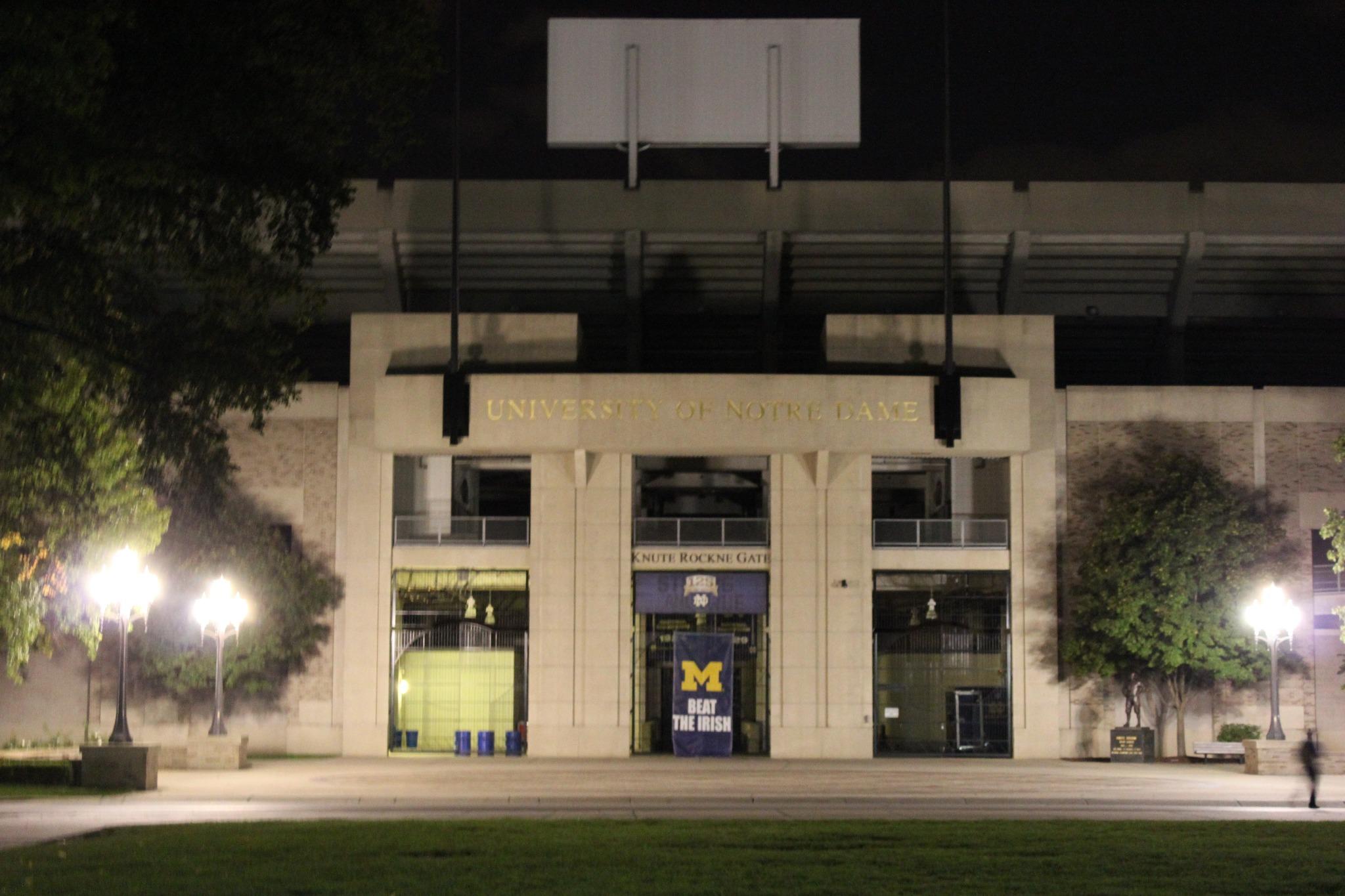 A picture arose on Twitter late Wednesday night that created a huge buzz and added even more flames to an already ablaze fire. Below is the Knute Rockne gate of Notre Dame Stadium which sits across from Touchdown Jesus and as you can see, something seems a little misplaced. Apparently a few students made the trip down to the stadium and hung this banner featuring the block M and relaying a message that reads "Beat the Irish." The kicker, the students were holding a little pep rally right around the corner. Priceless (or should I say, oblivious...).